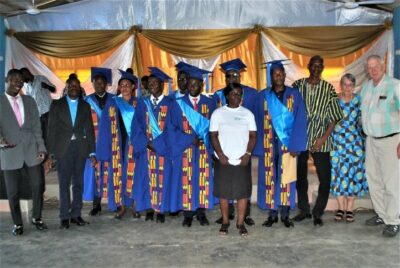 Michael and Johanna Johnson came for three weeks in September/October. Michael is on the Titian Ministries Board of Directors in Canada and Johanna is the sister of Pastor Gerrie Armaly, our International Chair. They, also, have been in Ghana many times. Mike and Johanna participated in all parts of our ministry. They have a special place in their hearts for our children. Mike and Johanna visited the older twins, Joshua and Joseph, who are in college for nursing and teaching. The younger ones, Peter and Paul, are with one of our foster mothers. They also saw Winning Star International School in session. Classes range from nursery to junior high school. Pastor Fred, the principal of the school and his wife, Blessing, are shown with their 4 children and 5 “new” children. When Blessing’s sister-in-law died during childbirth of the baby twin girls, they were the only ones in the family willing to take the children in. Through generous donations, we have been helping them care for these children. Before leaving, Mike and Johanna witnessed our 5th graduation of the IAM Bible School.